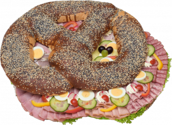 1 kg Brezen vom Langenloiser Bäcker. Gefüllt mit Aufstrichen, Wurst, Käse, Schinken und Braten. Reichlich garniert mit Salat, Tomaten, gekochten Eiern, Gurke und Radieschen.