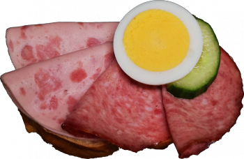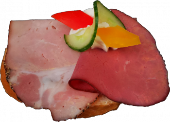 Sandwichbrötchen mit Kräuterbutter bestrichen, mit Lyoner und Wienerwurst belegt und fein garniert.