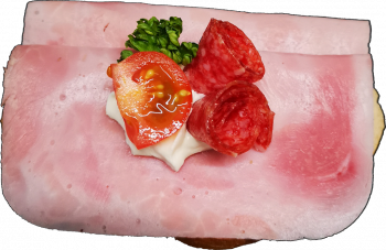 Sandwichbrötchen mit Kräuterbutter bestrichen, mit Toastschinken und Salami belegt und fein garniert.