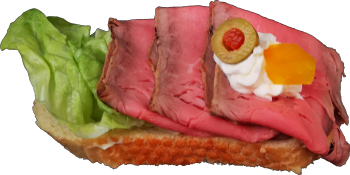 Sandwichbrötchen mit Kräuterbutter bestrichen, mit Braten belegt und fein garniert.